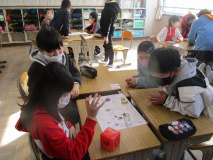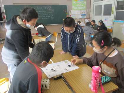 2時間目に“冬休みの思い出すごろく”をしました。サイコロの目にあわせて進み,止まったところのお題に答えます。前半は「冬休みに読んでおもしろかった本は?」「2021年の初夢は?」「おせちの中で1番好きなものは?」など,冬休みを振り返る内容が中心です。ゴールに近づくにつれて「今年の目標は?」「3学期に楽しみなことは?」など,3学期のめあてにつながるお題にしたのですが,友達とのやり取りが広がり,とっても盛り上がりました!