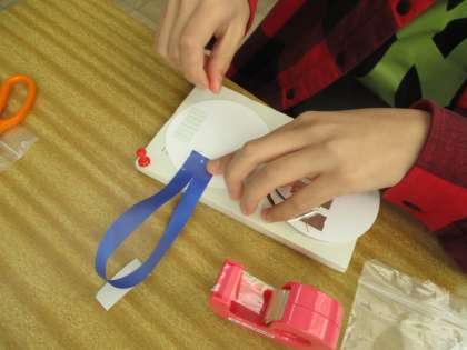 はくり紙をはがし,リボンを横に並べて貼ると完成です。