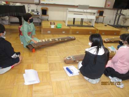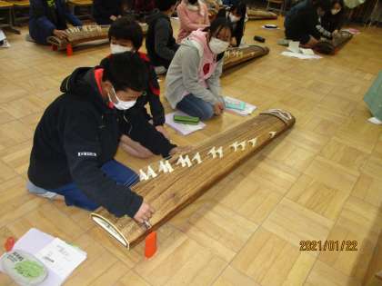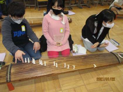 先週は,プリントを見ながら,指だけで練習しましたが,今日は実際にお琴の弦をはじいて「さくらさくら」を練習しました。