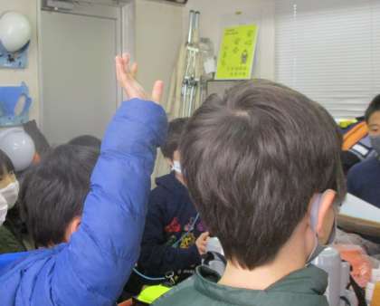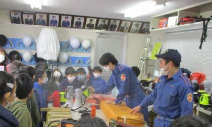総合の学習で地域の消防団の方からお話をききました。拍子木,ホースなどの道具も触らせていただきました。安全にくらせるように,地域の方が見守ってくださっているのを実感しました。
