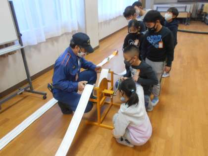 器具庫の中を見せていただいたり,ホースの巻取り体験をさせていただいたりしました。