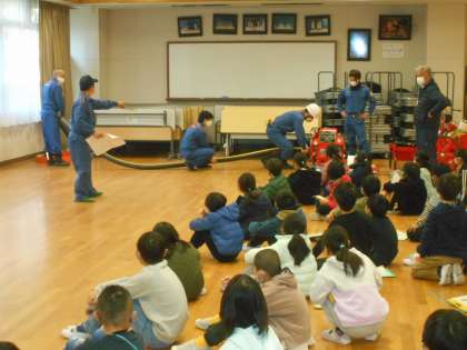 社会科の学習で消防団の方にお越しいただき学習しました。