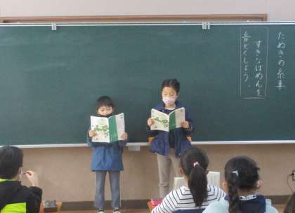 今日は「たぬきの糸車」を音読しました。