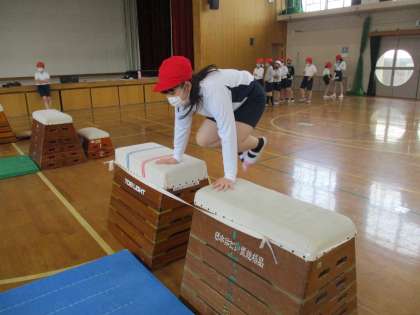 交流体育で跳び箱運動に取り組みました。今日は,縦の開脚跳びや横のかかえこみ跳びなどに,さまざまな練習の場を使ってチャレンジしました。腕を伸ばして体を支えたり,腰を高く上げたりすることを少しずつ意識できるようになってきました。