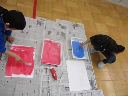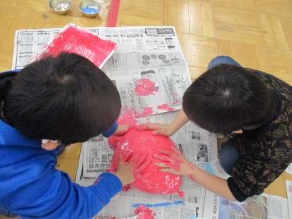 液体粘土に絵具を混ぜて,筆や手を使って,鬼のお面を作りました。冷たくて少しトロッとした感触を楽しみながら,工作しました。