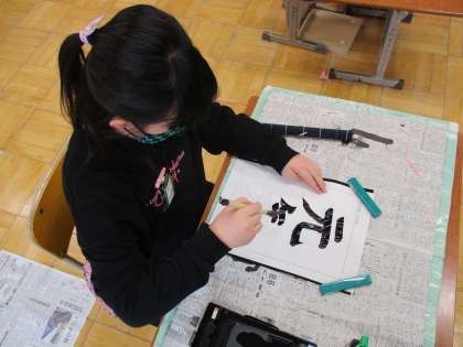 毛筆で,『元気』の字を書きました。曲がりとそりの違いに気をつけて書きました。
