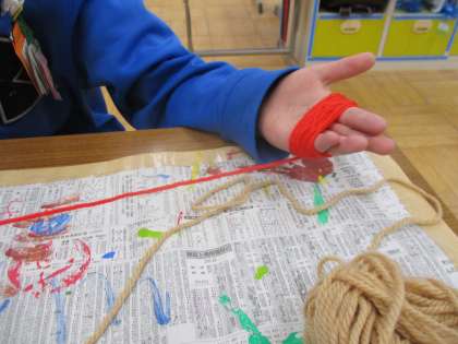 節分が近いので鬼のお面をつくりました。毛糸を指に巻き付けて髪の毛を作りました。指に巻き付けるのは,自分で考えました。かわいい鬼のできあがり。