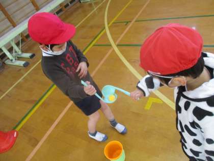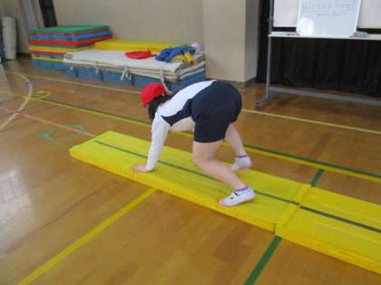 ピンポン玉運び,くまさん歩きなどいろいろな動きがあります。大きく体を動かすところ,ゆっくり気をつけながら動かすところ,それぞれ意識して取り組んでいました。