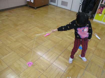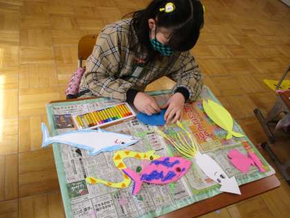学活で魚釣りゲームを作りました。磁石の形やクリップの止め方で釣りやすさが変わることを発見して楽しく試していました。