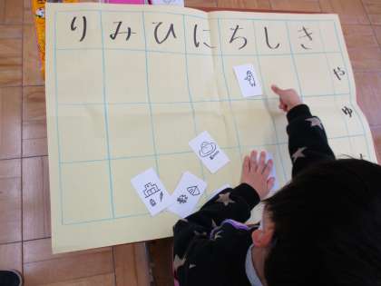 国語で,ねじれた音の学習をしています。絵カードを見て,どのマスの音が入っているのか,何度も発音して確かめていました。