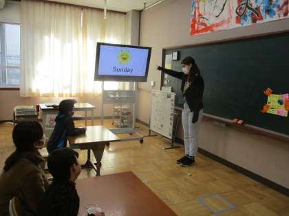 マキ先生といっしょに2月の英語の日の学習をしました。先生の発音をまねて「Monday」「Tuesday」・・・と月曜日から日曜日まで英語で言いました。英語の歌もいっしょに歌いました。