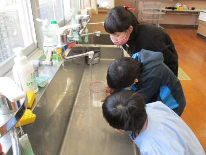 玉ねぎの皮の染料でハンカチを煮ている間に,ミョウバン液を用意します。赤い線まで上手に水を入れて,確かめながら進めました。