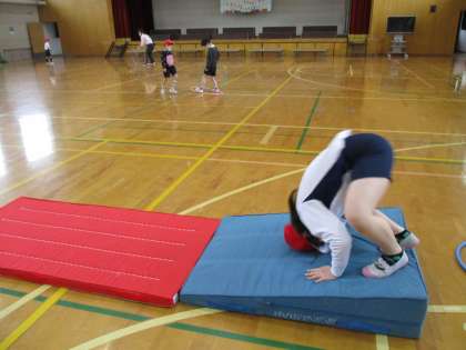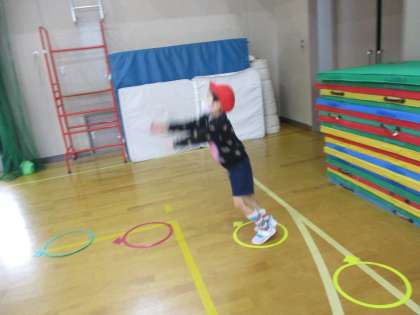 サーキット遊びに取り組みました。腕の使い方を意識して,跳んだり回ったりしました。