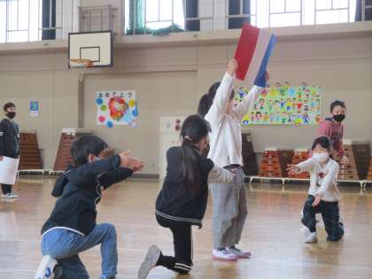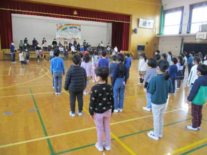 1年生は,お祝いの言葉を発表し,心を込めて作ったカードを渡しました。3年生は世界の言葉で「ありがとう」を伝え,「メルシー!」と大きな声で発表できました。みんな交流学年の友だちと一緒に頑張りました。