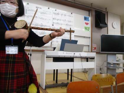 音楽室での授業も最後となりました。今日は,先生から珍しい外国の楽器を紹介してもらいました。その後,「旅立ちの日に」の練習をしました。