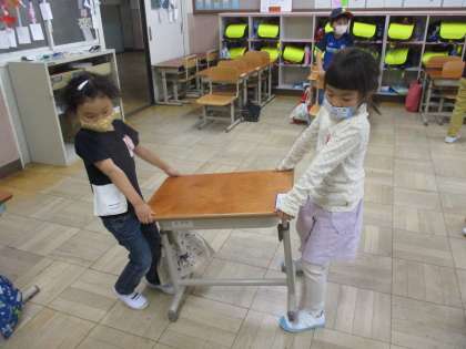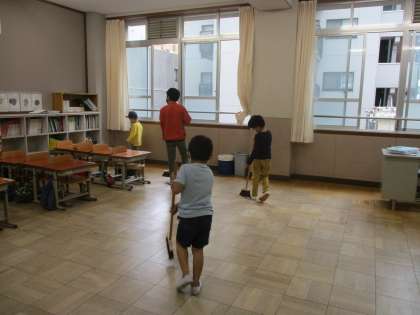 今週から自分たちでそうじを始めました。6年生のお兄さん,お姉さんに教えてもらいながら,ほうきや机・まどふき,黒板消しやごみ捨てなど,自分の仕事を一生懸命がんばっています。教室がぴかぴかになると気持ちがいいですね。