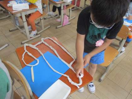 図画工作科で「ひもひもねんど」の学習をしました。まずはじめはねんど体操。大きな丸い形や四角,三角の形をつくってねんどをやわらかくします。ねんど体操の後は,短いひも,長いひも,細いひもなど,いろいろなひもを組み合わせて形をつくりました。