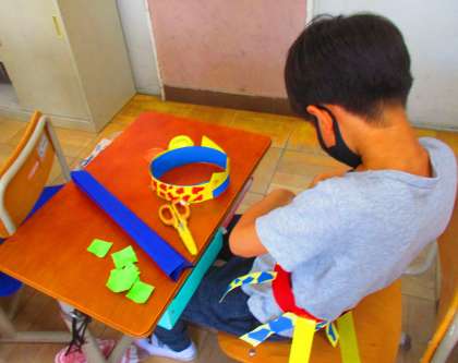 「猫になりたい!」!「王冠にする!」「剣をさしてもいいですか?」など,たくさんのイメージを膨らませながら取り組みました。