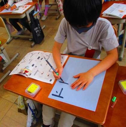 今日は2年生になって初めて水書筆を使っての学習をしました。