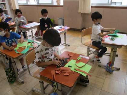 図画工作で,「やぶいたかたちからうまれたよ」の学習をしました。画用紙を手でやぶったりちぎったりしてできた形を並べて,何に見えるか想像しながらつくりました。「くじらに見える!」「これは何かな。」とやぶった形をじっくり見ていました。