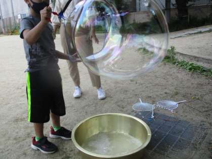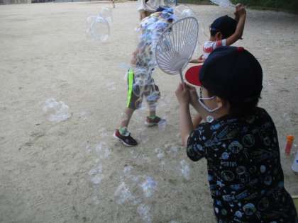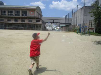 シャボン玉液ができると,うちわを持って木陰から運動場の真ん中へ勢いよく,走っていきました。今日は晴天,大きなシャボン玉が空に広がりました。