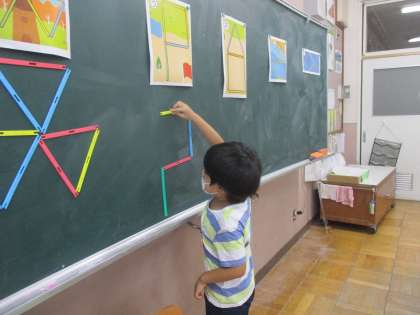 算数では「かたちづくり」の学習をしています。三角形の色板や棒を使って,いろいろなかたちを作りました。楽しい活動を通して,三角形が2つあると大きい三角形や四角形が作れること,棒が3本あれば三角形,4本あれば四角形ができることなどを確かめました。