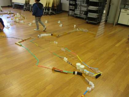 図画工作科で「ならべてならべて」の学習をしました。たくさんの材料を並べて,多目的室に楽しい世界をつくりました。まっすぐ並べたり,ぎざぎざにしたり,坂道をつくったりと,どのように並べたらおもしろいかを工夫していました。最初は一人ひとり小さな世界でしたが,最後には全員がつながって,すてきな世界ができあがりました。