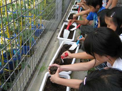 7月14日(火)6校時の園芸委員会で, コスモスの苗をプランターに植え付けました。秋にはピンクや白の清楚な花を咲かせてくれるでしょう。楽しみですね。