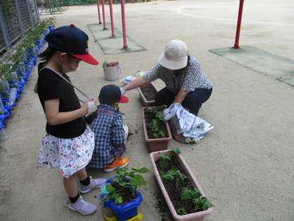 子どもたちが育てているあさがおが,どんどん大きくなってきました。今週は,五感を使って,観察しました。観察して考えたことや思ったことを交流する中で,大きくなってきたあさがおが植木鉢の中で狭いのではないか,という意見が出ました。そこで,何本かのあさがおを植木鉢から抜いて持って帰ったり,学校のプランターに植え替えたりしました。これからも生長が楽しみです。