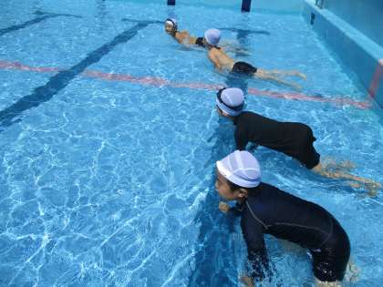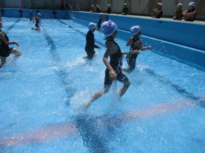 水あそびが始まりました。お天気もよく,子どもたちはとても楽しく活動していました。今日は,水の中を歩いたり走ったり,わにになって歩いたりして楽しみました。