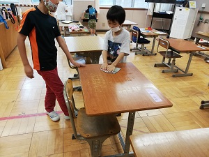 高学年が一生懸命1年生に雑巾の使い方を教えてくれています。