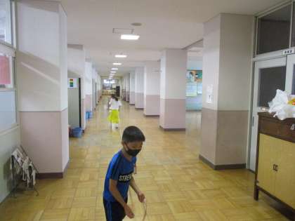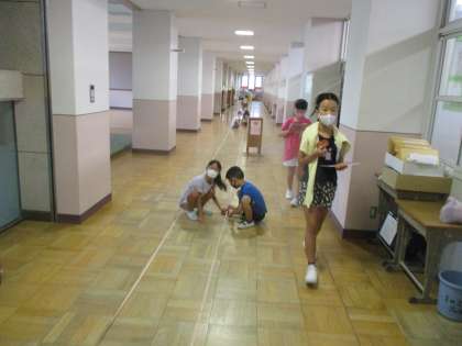 算数科の「長さ」の学習で運動場や教室,廊下にある場所や物の長さを測っています。友達と協力して熱心に測定していました。