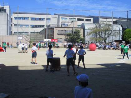 3・4年の「大玉転がし」は1・2年生の時と比べてとても大きな大玉です。3・4年生の子どもたちは力いっぱい大玉を押していました。