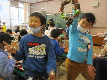 あさがおの弦を使って作ったリースの飾り付けを交流学級と行いました。