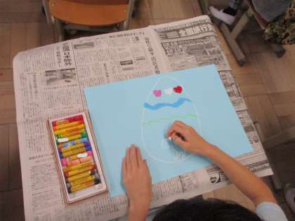 図画工作科「ふしぎなたまご」の学習をしました。ふしぎなたまごを想像し、さらにそこから、たまごを割った後の楽しい世界も想像して描きました。子どもたちは、とても楽しそうに描いていました。