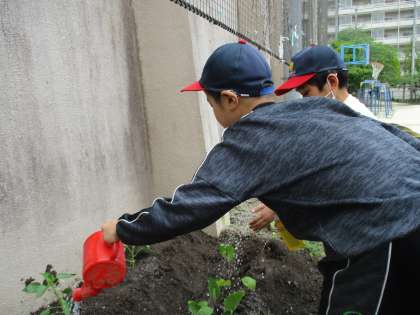みんなでピザを作ろうとトマト、ピーマン、ナスを育てることにしました。