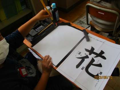 4年生になって初めての毛筆の学習では,「花」という字を書きました。筆使いに気を付けてていねいに書くことができました。