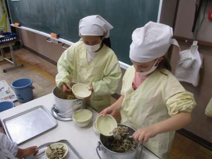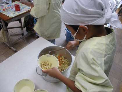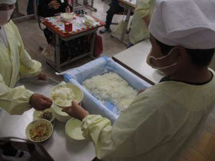 協力して給食当番を頑張っています。おかずを入れたり、配ったり。少しずつ上手になってきています。