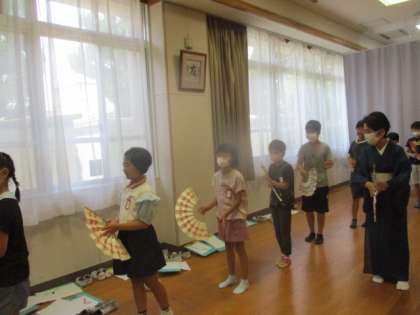 日本舞踊の先生による華麗な動きや扇子の扱いを見せてもらい,目を丸くしていました。
