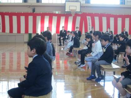 運動場の桜の花が1年生の入学をお祝いするかのように咲く中、49名の1年生が入学しました。体育館の中では、緊張した表情の子どもたちでしたが、教室に入ると担任の先生との初めての出会いに嬉しそうな表情を見せてくれました。