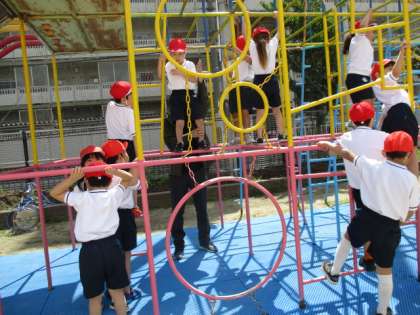 体育の学習では運動場に出て、ゆうぐあそびをしました。