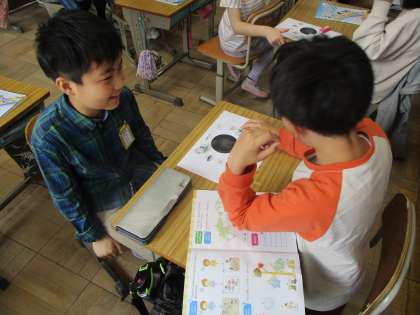 ワークシートを使い、すごろくに似たゲームを通して天気の言い方を頑張って覚えている子どもたちです。