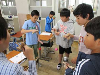 友だちと教え合ったり,勝負をしたりして,楽しそうにけん玉をしています。