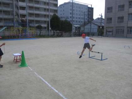 トン・1・2・3のリズムで3台のハードルを跳びこします。