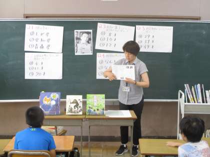 そのお話の作者の「新美南吉」について図書館司書の富森先生にブックトークをしていただきました。