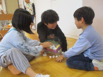 1組が2組を招待して、いっしょに遊びました。看板やルールも工夫して、どうしたら楽しんでもらえるかを一生懸命に考えました。2組のお友達が楽しんでくれて嬉しかったですね。