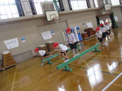 リーダーになった人のまねをして、平均台やマット、ケンステップなど、色々な場で取り組みました。
