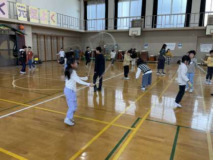 中間休みに運動委員会主催「ファイヤージャンプロープバトル」がありました。予選を勝ち抜いた1組は、みんなで声を掛け合って練習し、本番に挑みました。どの子も予選の記録より跳んでいました。