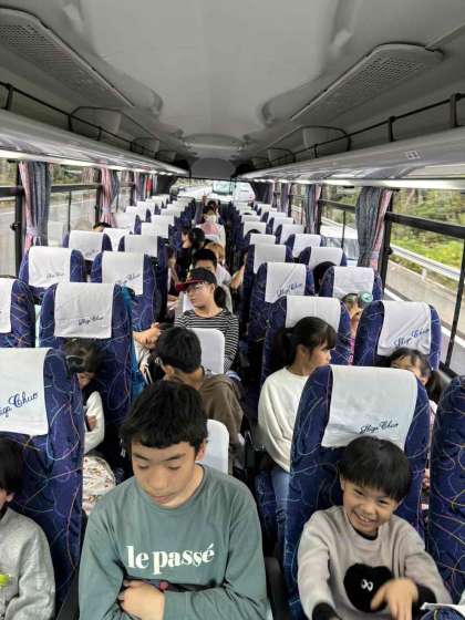 バスで学校に向かっています。疲れて眠っている子や、おしゃべりを楽しんでいる子、もうすぐ到着します。