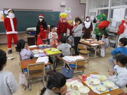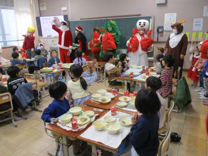 今日は2学期終業式がありました。給食時間にはPTAボランティアの皆さんが、サンタやトナカイに扮して教室に入って来られ、子どもたちからは大歓声が上がりました。サンタクロースからプレゼントもいただきました。校章のマークが入ったコップをもらい、みんな大喜びです。ボランティアの皆さん、本当にありがとうございました!メリークリスマス!!